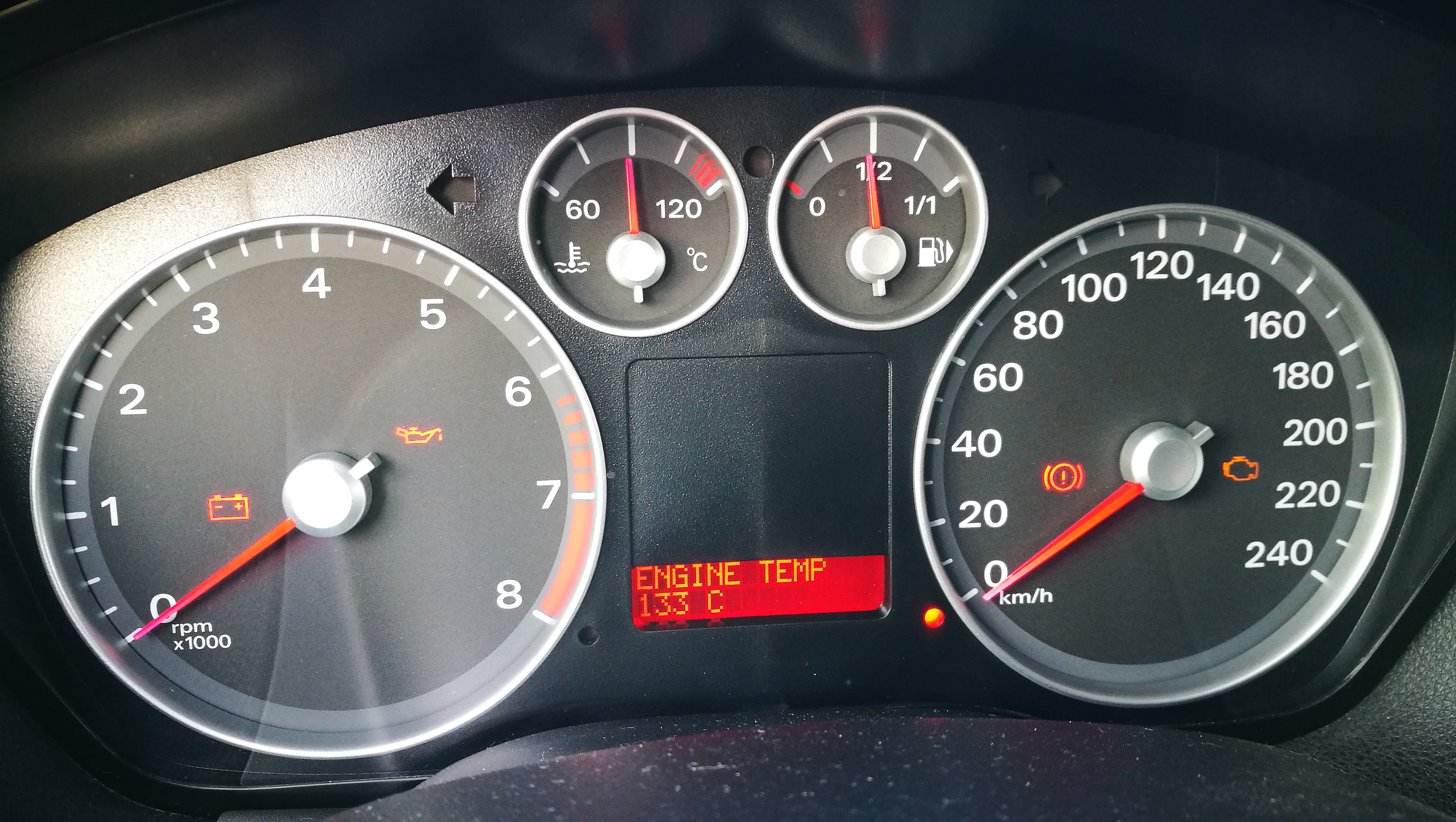 Виждам, че стрелката за температурата на таблото си стои по средата на уреда и не се отклюнява. Не ми показва да е прегряла.