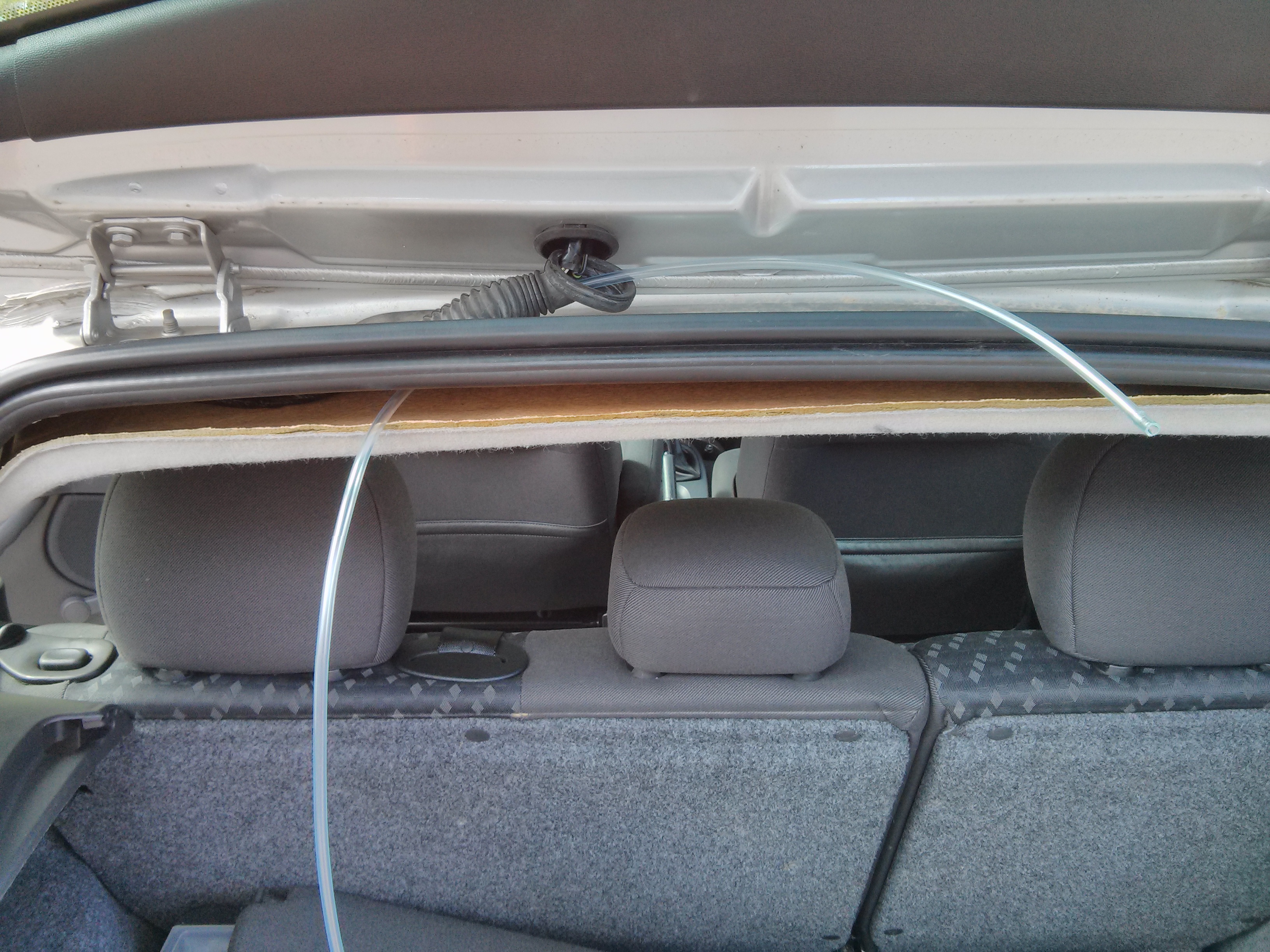 За да се открие достъп до него, трябва да се свали пластмасовата кора на задната колона. Обаче за да се свали тя, първо трябва да се свали (по скоро отмести леко) пластмасата над машинката на колана: Наставката е точно над триъгълното прозорче: Още като го разкачих ми направи впечатление че пръсна няколко капки, което е добър знак че течността стига до там: Съединението представлява това (вътре има съчма и пружинка): Естествено запушено: След малко почистване с една игла, ето това излезе от него: Добре че преди да го сложа обратно, реших да пробвам дали течността стига до тази наставка: