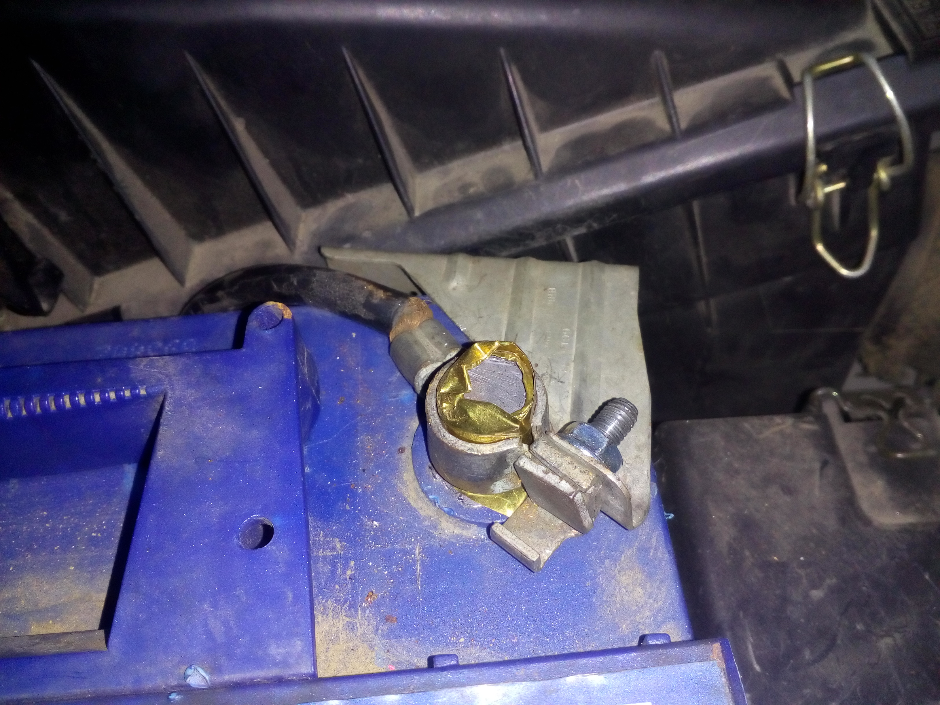 Въпреки че е затегната наистина до край, клемата на положителния полюс на акумулатора е толкова хлабава, че направо се вади от пин-а на акумулатора. Поради това подходих с българска инжинерна мисъл и уплътних луфта с два пласта тънка медна ламаринка (така, както е показано на снимката) Въпросът ми е подобно побългаряване би ли могло да създаде някакъв проблем ( двигателят е 1.8 ТДИ Ендура Д) или мога да си карам съвсем спокойно. ОСвен това предвид, че акумулатора е съвсем стандартен от разпространена марка от какъв зор се получава тази разлика в диаметрите, че клемата да се вади свободно и при максимално затягане ?
