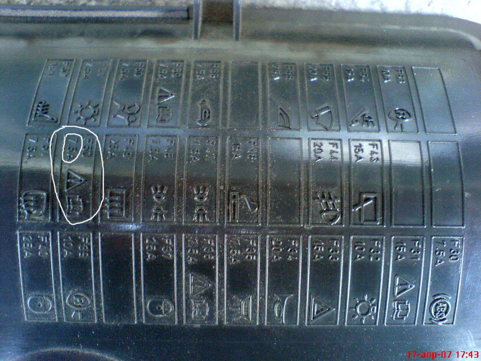 Прикачам и снимката на капачето на бушоните. Там си пише 7,5 А и с толкова го смених. Не посмеях да рискувам.