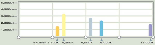 От тaзи диаграма можете да видите че ксеноновите крушки с цветова гама 4200К произвеждат най-много светлина (3200Lm) и то почти 3 пъти повече от стандартна халогенна крушка (1200Lm).