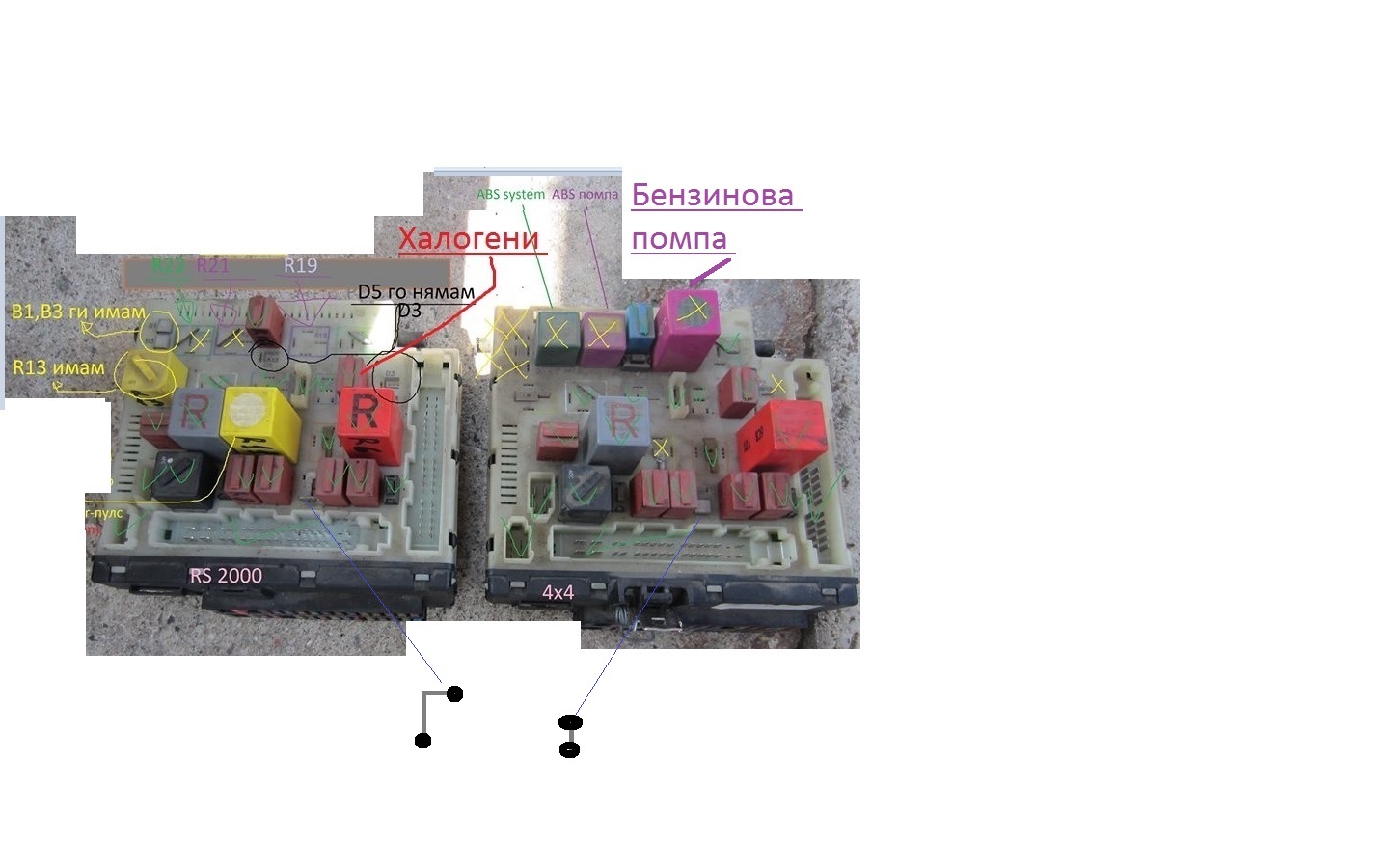 Мерси за информацията колега.Просто искам да съм запознат кое за какво е.Ще поровя още малко да знам за въпросните мостове( какво точно прехвърлят) . В случая на снимката има доста разлики м/у рс 2000 и 1.6 4х4 . Бензинова помпа , релето за плафона ( 20 сек ) 2 броя релета за АБС ( ако вярно съм ги изровил като информация в нета )- тези са ясни.Но има 2-3-5 моста различни, както и един диод в повече от страната на 4х4-то.