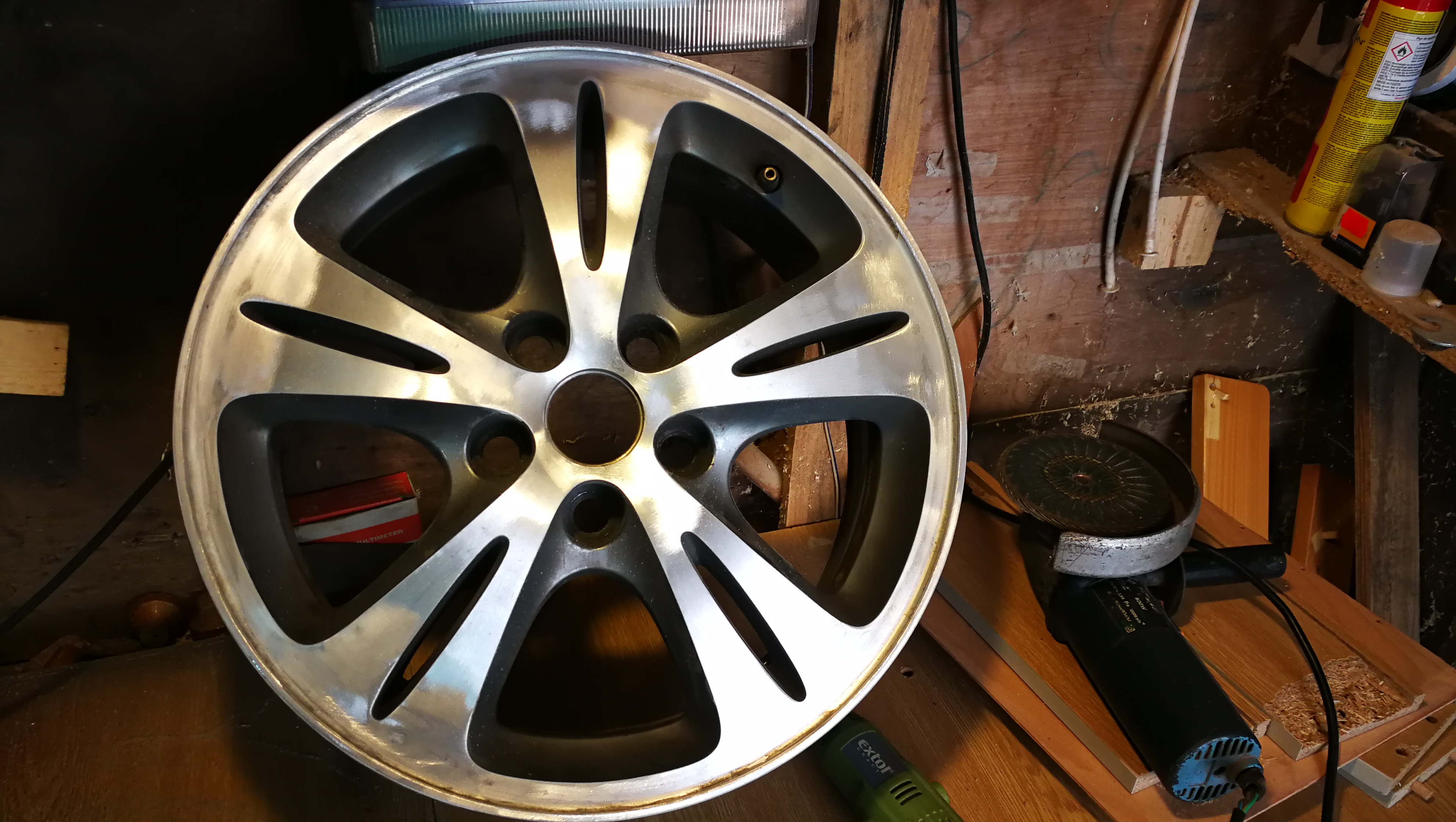 На Форда,лорда купи алуминиеви джанти. Но са в доста лошо състояние. Опитах да ги чистя и ударих на камък. Не знам какво е покритието. Дали е хром или е някаква боя приличаща на хром. Носих ги на песъкоструика и нищо. Само матира покритието но не можа да го свали. А на места покритието е напукано и от долу под него е повдигнато все едно от ръжда. Някаква бяла субстанция под покритието. По тази причина трябва да сваля цялото покритие. Опитвах и с шкурка но е много, ама много трудоемко. Едната джанта я направих с дрелка и шкурка (много парчета шкурка залепени върху ос. Не знам как се нарича. Отне ми цял ден работа. Дайте някакъв съвет за нещо по-лесно. Това е почистената джанта.