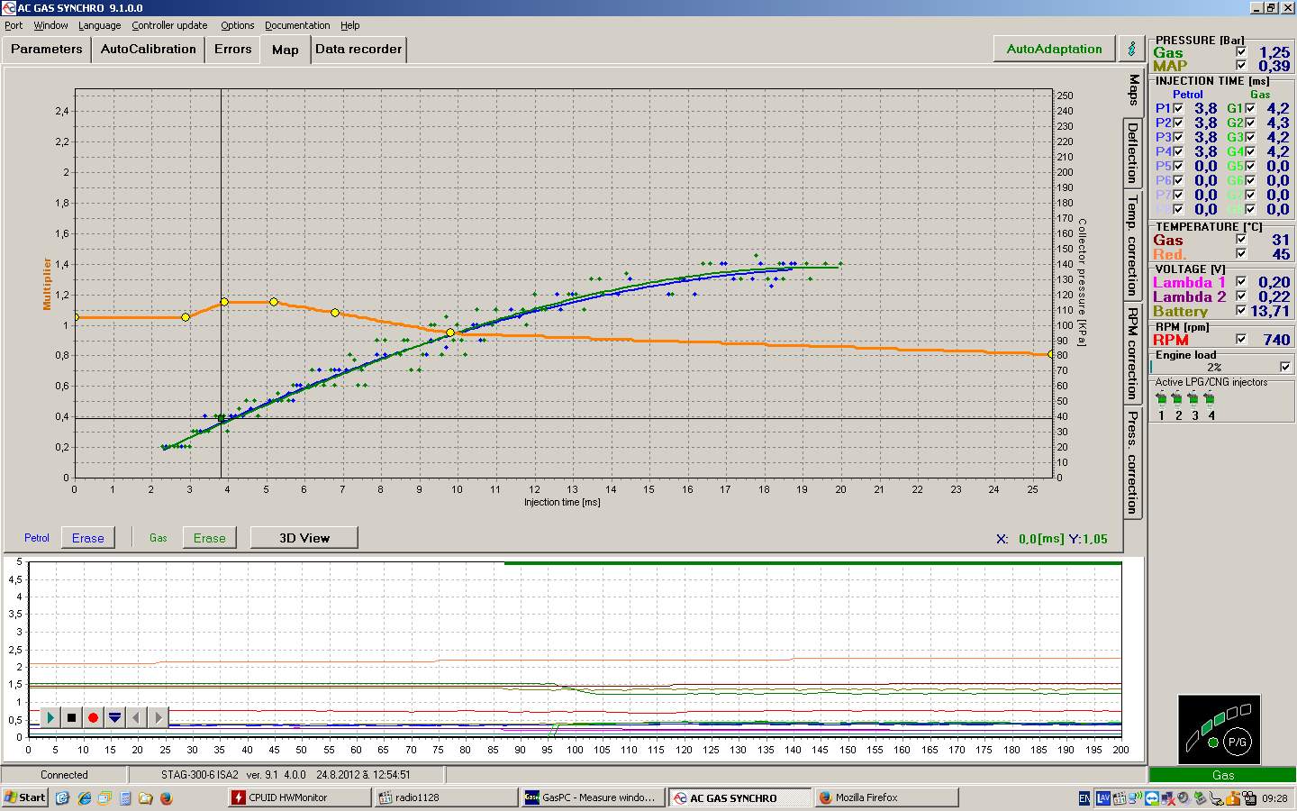 Има си основни параметри, като температури на превключване, допустимо минимално/максимално налягане на газта и време за възстановяването му, които е по-добре да се оставят със "заводски" настройки - не напразно производителите са ги заложили, чели са дебели книги и са правили лабораторни упражнения. Дозирането е въпрос на познания за горивния процес и адаптивните функции на бензиновия компютър. На посоченият газов контролер (ако е същият от линка и софтуерът е показаният на картинката) могат да се направят настройки, близки до идеалната работа - само трябва с помощта на червените точки да се докара зелената линия точно върху жълтата. В това положение, бензиновият компютър не вижда нужда да прави ± корекции на инжекторните времена и съответно няма да записва грешки за неправилна горивна смес.