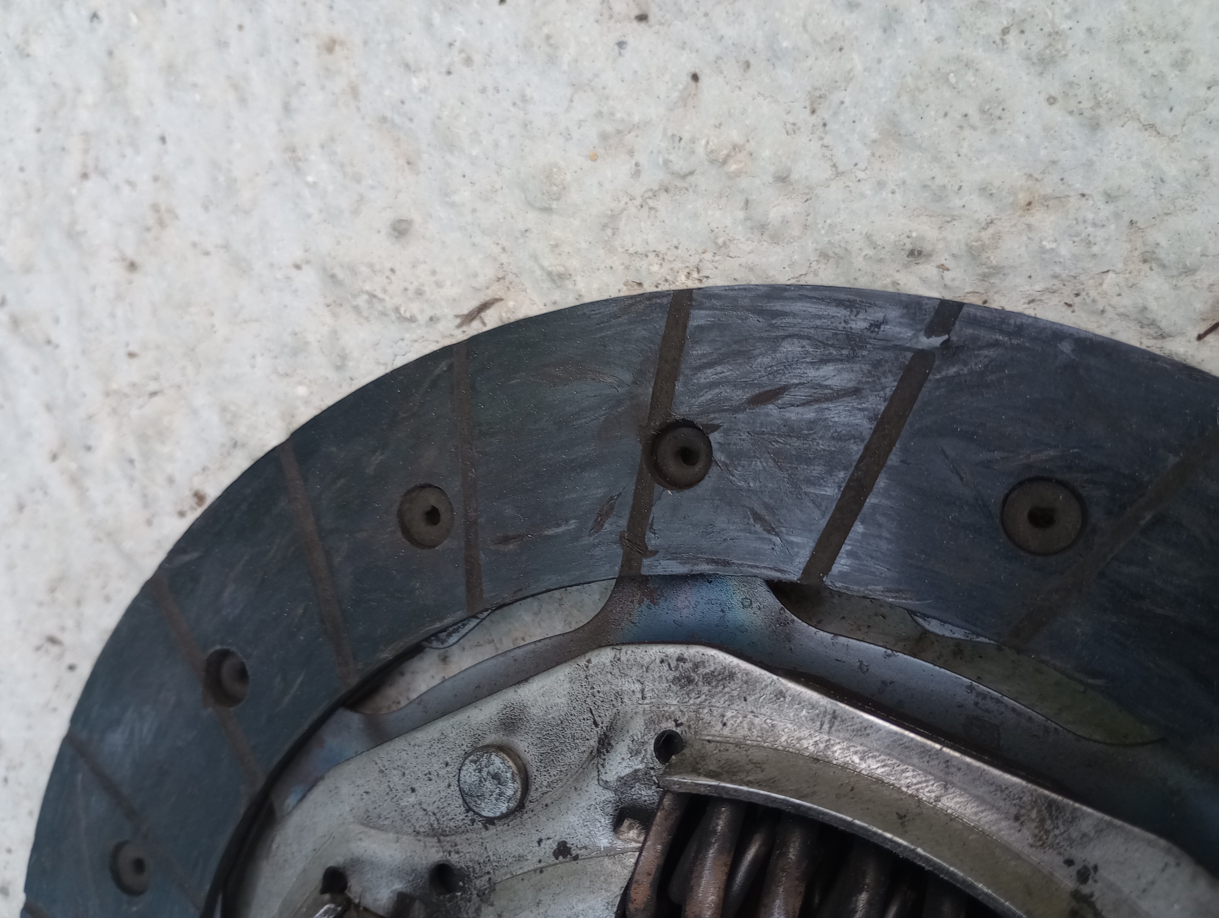 Вчера смених горна помпа на педала. Няма никаква промяна. Вторник ще сваля кутията за да сменя съединителя. Като се замисля този съединител съм го сменял на две три години все така. Нещо е преправяно по тази кола не както трябва. Преди обвинявах жена ми че го държи натиснат, но явно не е от нея. Снимката е от феродовия диск, който свалих преди две години. Приплъзване, а изглежда има още много живот в него. Не разбирам защо не изкарват до края. Очаквам и този да е така. Между другото, когато го разглобих последния път и видях колко месо още има реших че тече семеринга на коляновия вал и го омазнява, въпреки че е прилично сухо. Смених семеринга. Скъп беше и със специално приспособление, което върви със семеринга. Така че не мисля да е от омасляване.